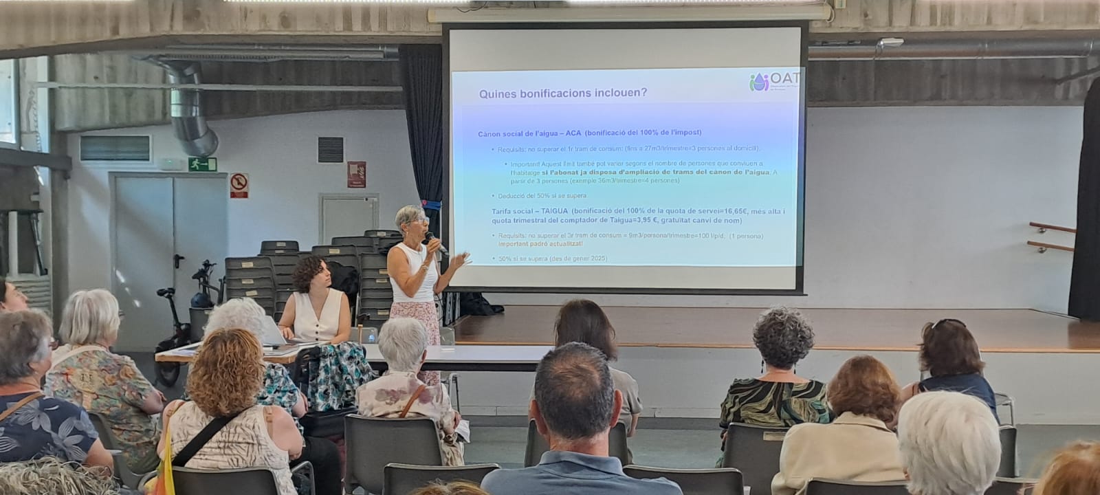 Aparte, de los cambios tarifarios, también se hizo una exposición sobre las ayudas sociales a la factura del agua: la tarifa social que aplica el agua y el canon social que aplica la ACA. Se explicó cuáles son estas ayudas, a las que van dirigidas, y cómo y dónde tramitar la petición.