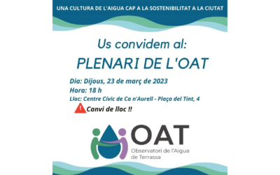 Ja tenim aquí el primer Plenari de L'OAT del 2023. Parlarem sobre un Pacte per l'Aigua a nivell de ciutat, sobre la futura renovació de diversos càrrecs i sobre com van els diversos projectes relatius a l'aigua a la nostra ciutat. Plenari presencial (obert a la...